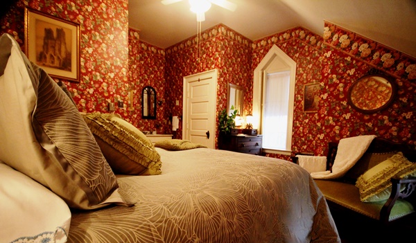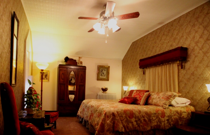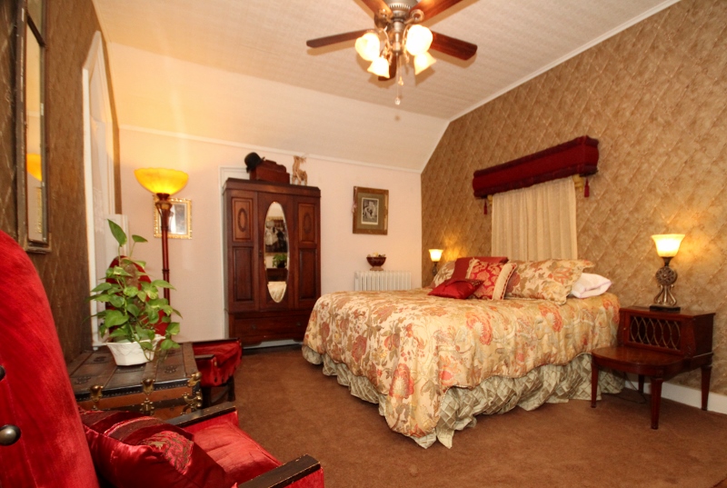 This beautiful floral-décor room has a queen-size bed and antique settee. You control the lighting to be bright and cheerful or for an intimate setting. Along with antique furniture, the room has a ceiling fan and separate climate controls for comfort.