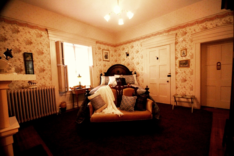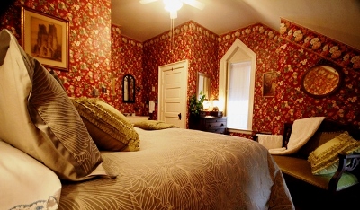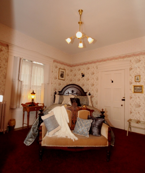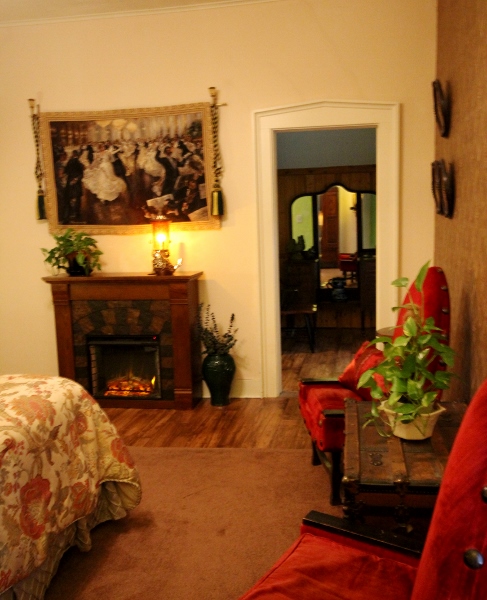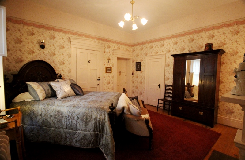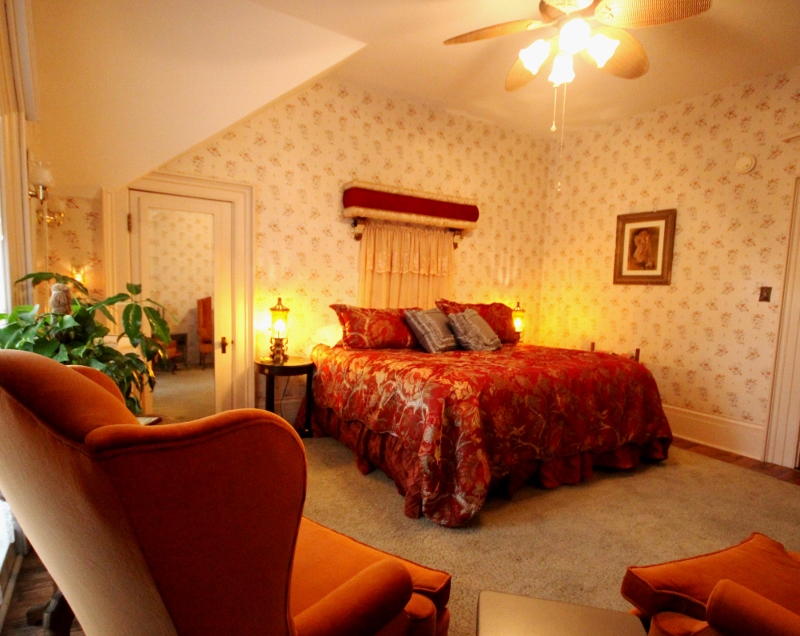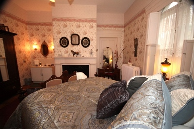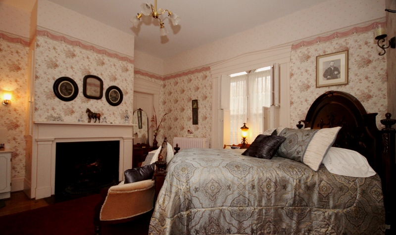Our first floor room has a beautiful queen-size bed with pillow-top comfort. The room proudly displays memorabilia and photographs to reflect our country’s rich heritage. It has an electric fireplace within the original 1860 fireplace box and mantle for year-round ambience. The room has its own entrance from the portico for privacy yet easily accesses the remainder of the house.