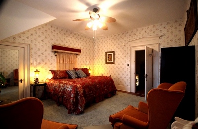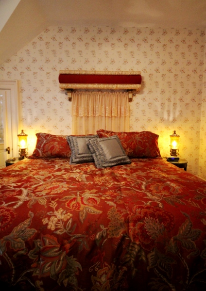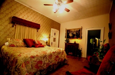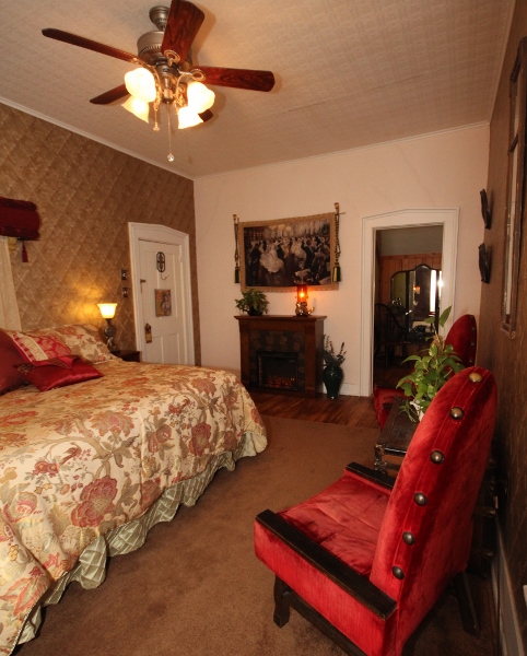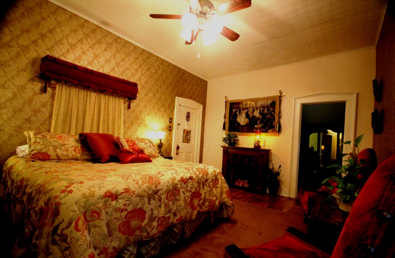 This second floor room honors our local marine and grape history with a warm, inviting décor, a king-size bed, the warmth and glow of an electric fireplace with mantle and a ceiling fan for your comfort, finished with "user-friendly" antiques and old-world charm for your great get-away.